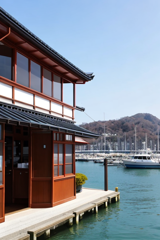 nostr:npub102ca8pnhy26vh2akepgr4vleyew65nuzug5val3sycslfe0wruwqzezyfp imagine photograph a cafe on the corner near a harbour near the sea of Japan, it is winter, but sunny. There is a boat on the water which has a white flag.