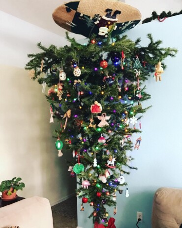They used to actually hang the trees from the ceiling. My mom said they did it because the houses were too small, to put them on the floor. Like this.