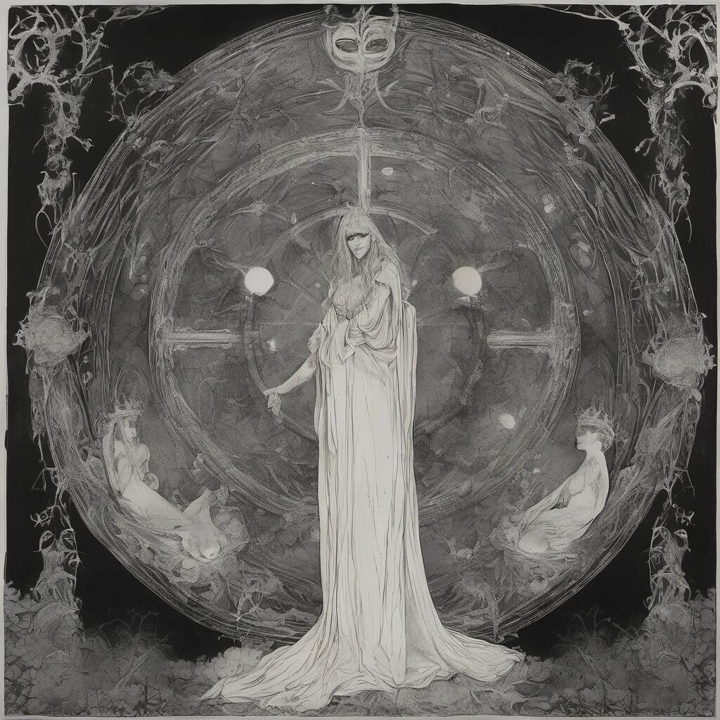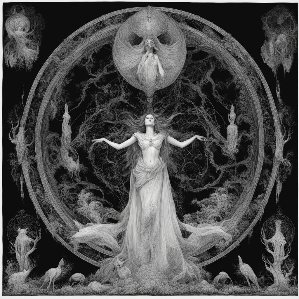nostr:npub1p5qe4mtwxascahtp6szght2nlp06gwwwwllq7e7g6308p4y9dvys8nw2sf draw for me dreambooth: O triple form of darkness! Sombre splendour! Thou moon unseen of men! Thou huntress dread! Thou crowned demon of the crownless dead! O breasts of blood, too bitter and too tender! Unseen of gentle spring, Let me the offering Bring to thy shrine’s sepulchral glittering!
