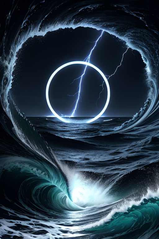 Imagine a modern detailed lightning network lightning bolt surrounded my a circle floating above a sea of violent waves