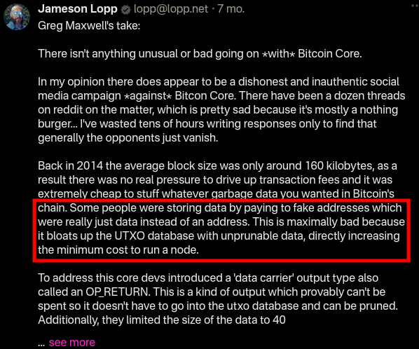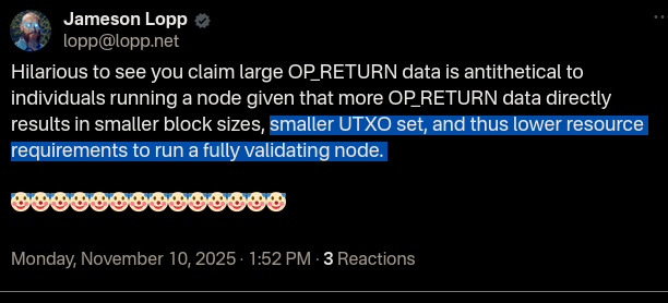 Not long ago he was saying UTXO set bloat is "maximally bad" now he is saying "utxo set size is a complete non-issue".