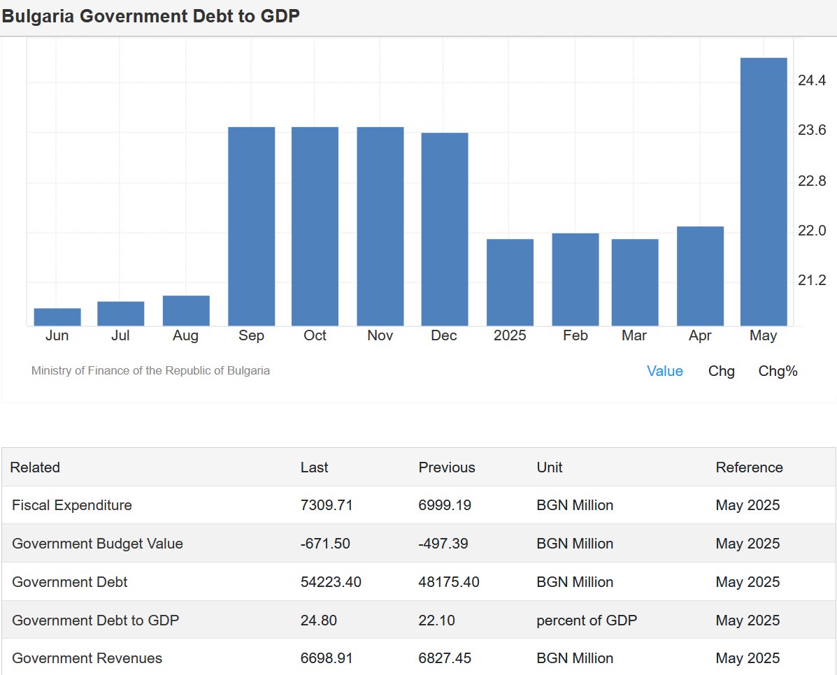 Bulgaria’s May debt-to-GDP just hit 24.8%. That’s BGN 54.2 billion in government debt.