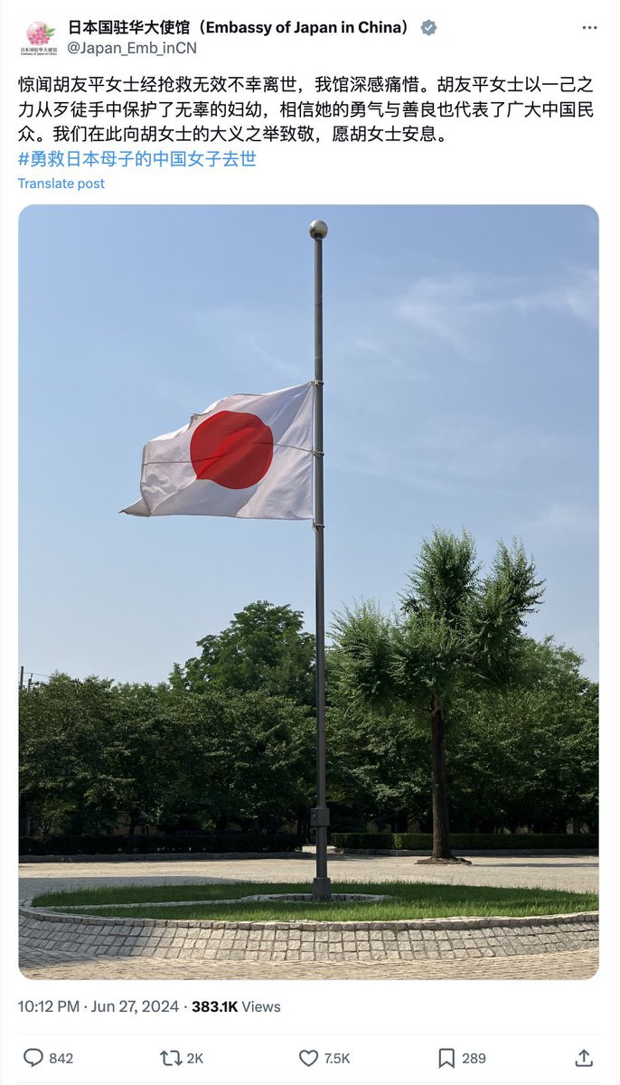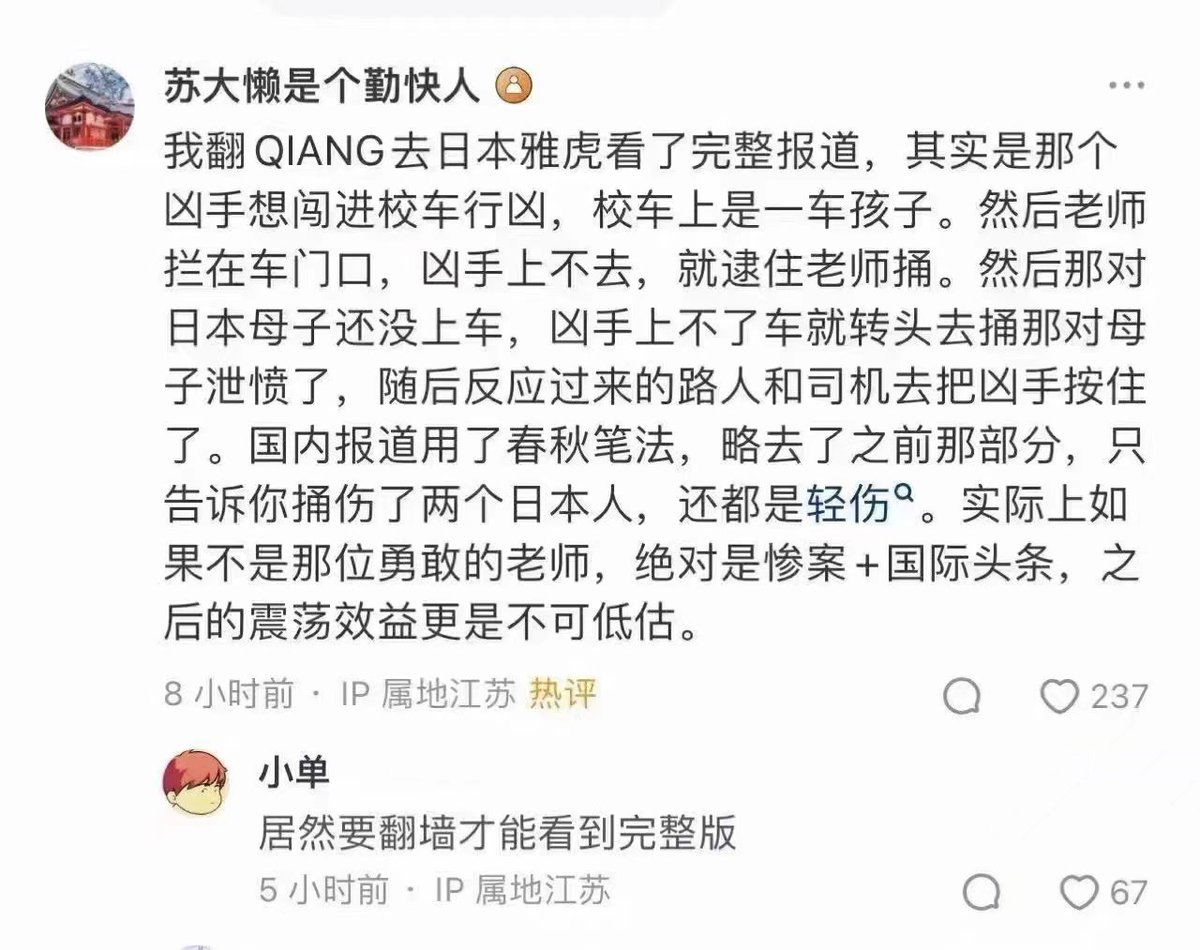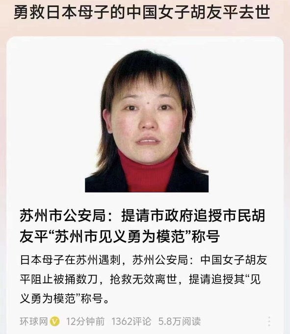而事发地是校车离开学校后的第一站,车内应该几乎是满员的(报道还称当时有两辆校车同时进站,发生凶案的是第二辆车)。站台上受伤的母子应该是准备从车上接孩子,而不是要上车,也不是刚刚从车上下来。按照常理,校车上有随车职员,在开门关门,上下车时进行观察,疏导,保护,而正是这名胡女士在履行工作职责的时候看到了想要冲上车的凶手,于是死死堵住车门,英勇殉职,也挽救匪国于一场外交灾难。对于红匪的不知耻,不感恩,我表示不意外。