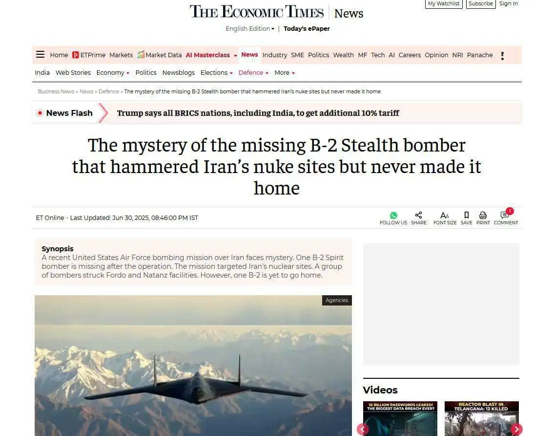 Apparently a B2 bomber never made it home after passing Over Iran in the latest bombing campaign on Fordow.