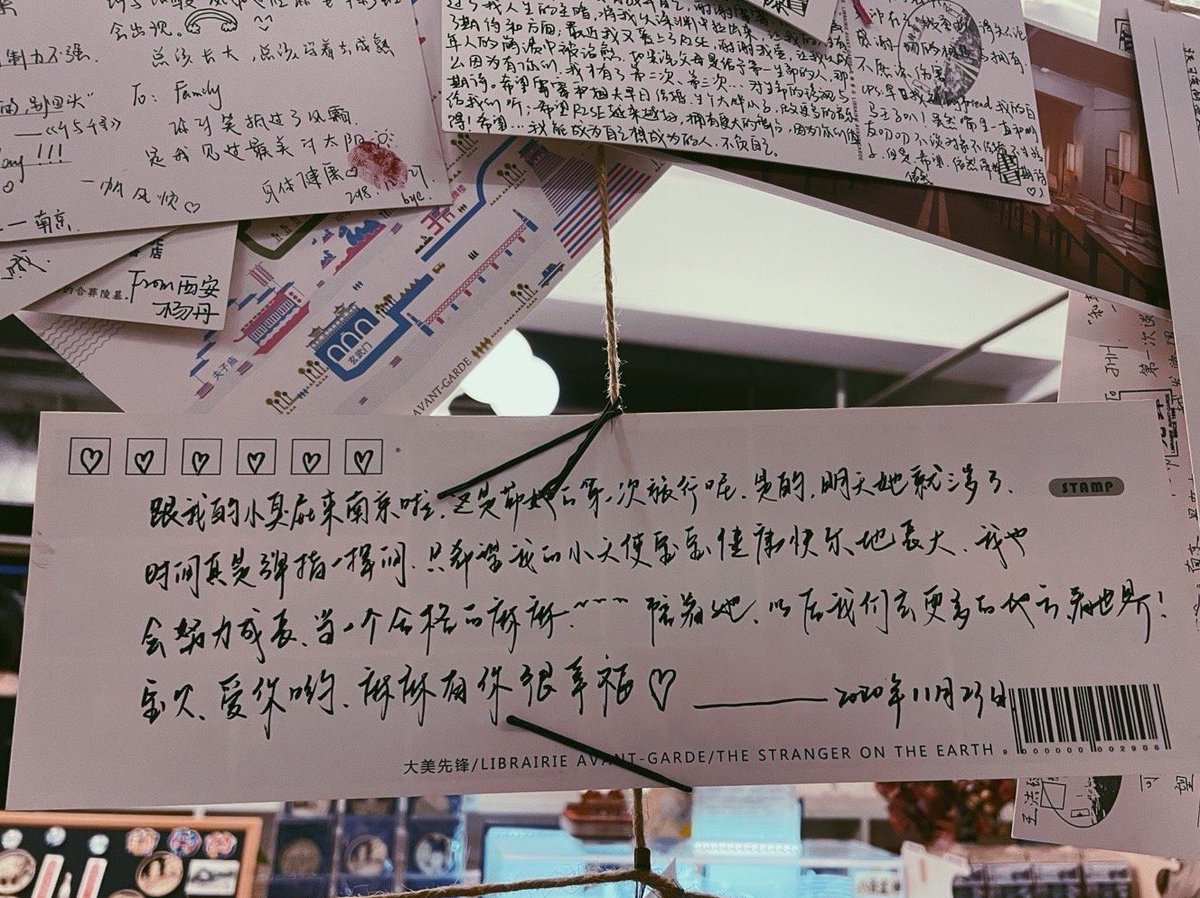 先锋书店的明信片墙,真的很喜欢这片为“异乡人”开发的小世界,在这里可以与他人有心灵上的交流。不管是失意的、思念的、痛苦的、意气风发的、充满希望的、迷茫的、幸福的、勇敢的…..心情或执念都能得到抒发,抑或是被慰藉,也让人有了一个时机去思考。
