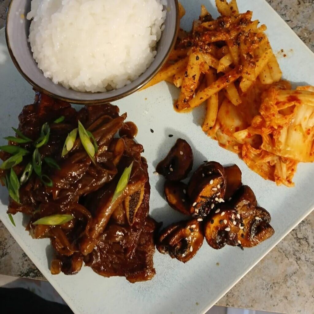 Galbi, raddiah saengchae, kimchi, spicy-sweet&sour mushroom namul https://www.diningandcooking.com/1894441/galbi-raddiah-saengchae-kimchi-spicy-sweetsour-mushroom-namul/ #Korea #KoreaFood #Korean #KoreanFood