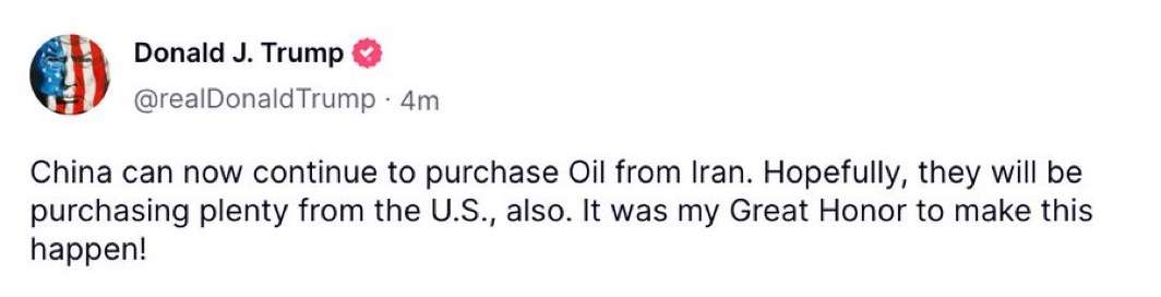 BREAKING: TRUMP: “CHINA CAN NOW BUY OIL FROM IRAN - AND HOPEFULLY FROM US TOO”
