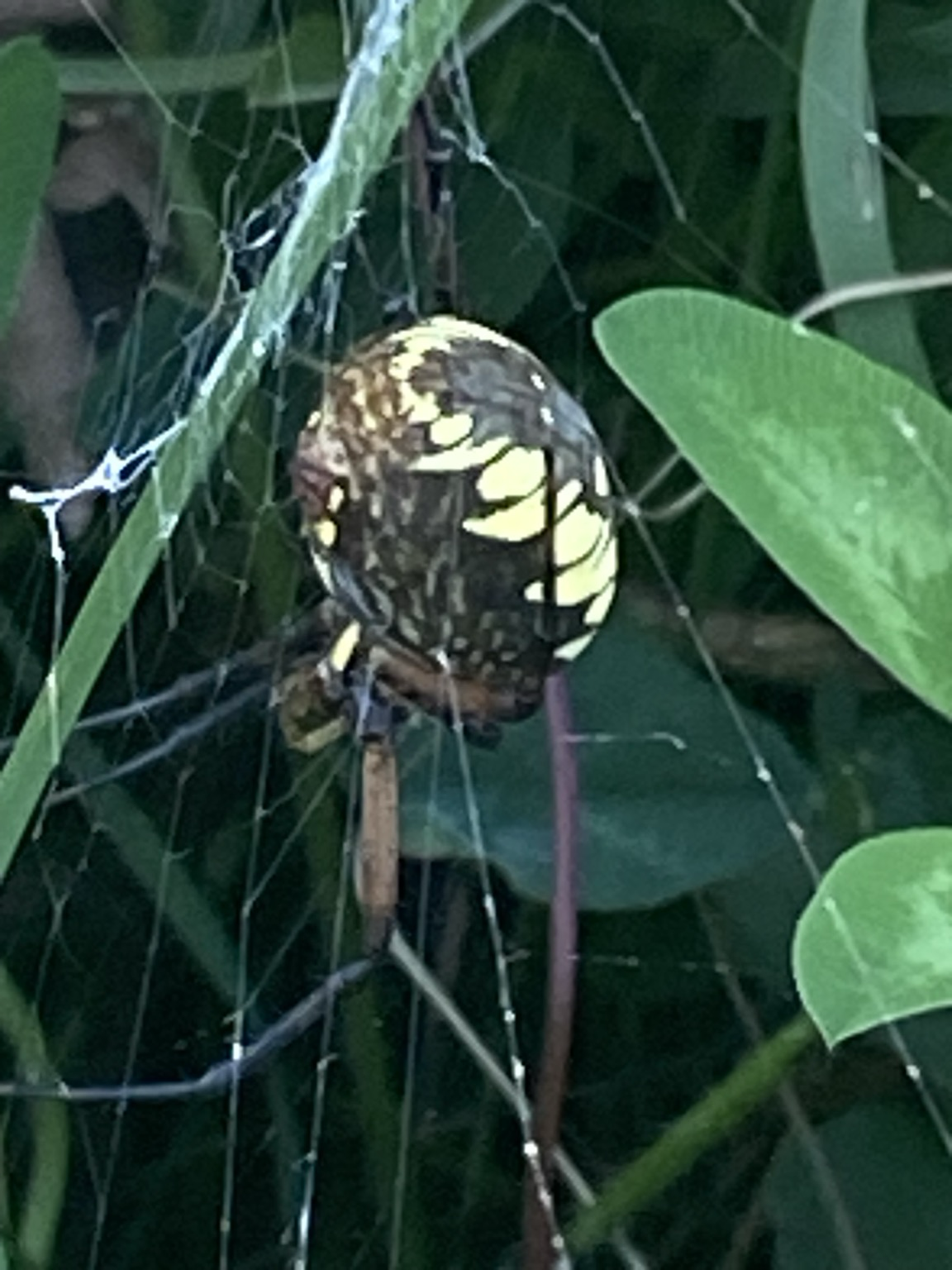 August 7, 2025. The patches of purple clover are habitat to crickets, grasshoppers, and katydids. The orb spiders are the predators. The predation is going well as there are four fat orb spiders in this clover. Only one spider is shown. #minnesota, #nativeplants, #pollinators, #spiders
