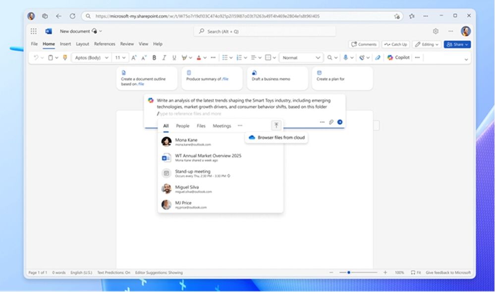 الآن، يستطيع مستخدمو “Copilot” في تطبيق Word على الويب الوصول إلى مجلدات كاملة مخزنة على منصات التخزين السحابية مثل OneDrive وSharePoint.