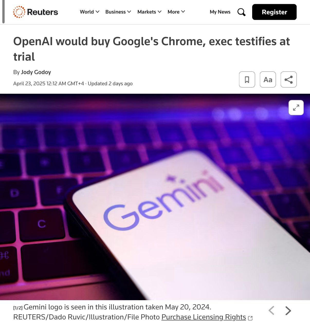 خلال محاكمة مكافحة الاحتكار ضد Google، صرّح مسؤول في OpenAI أن الشركة قد تشتري متصفح Chrome إذا تم إجبار Google على بيعه. جاء ذلك في سياق سعي وزارة العدل الأمريكية لتقليص احتكار Google لمحرك البحث.