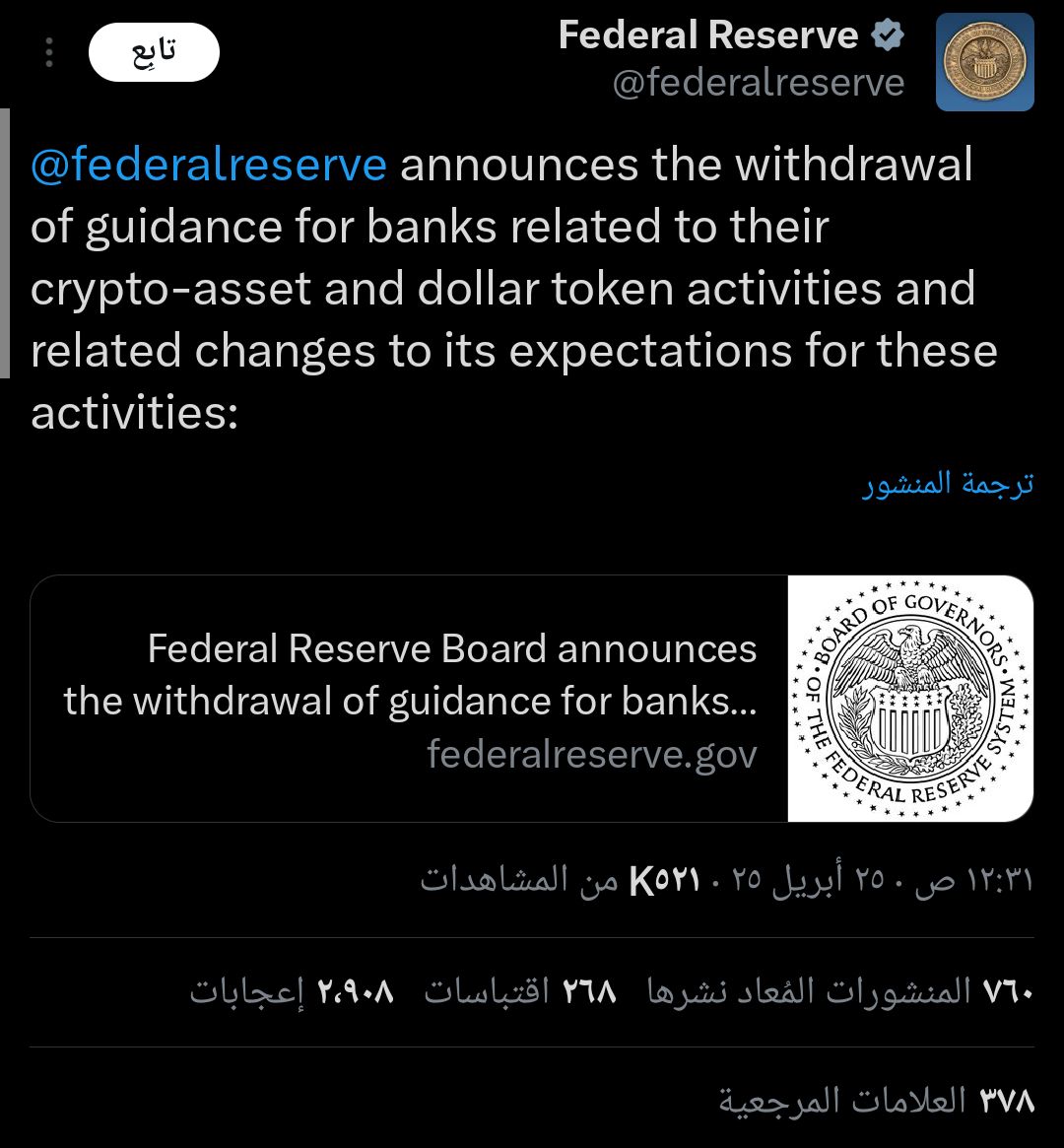 قبل قليل أعلن الفدرالي عن سحب التوجيهات السابقة المتعلقة بأنشطة البنوك في مجال الأصول المشفرة والعملات الرقمية المرتبطة بالدولار (Dollar Tokens)، كما أشار إلى تغييرات في توقعاته بشأن كيفية تعامل البنوك مع هذه الأنشطة