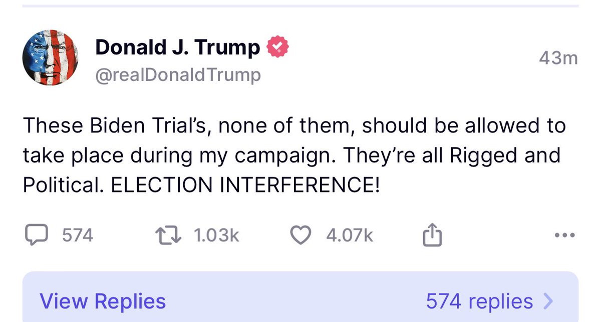 Trump is right. These trials are ELECTION INTERFERENCE! https://t.co/2ibbSouwZq