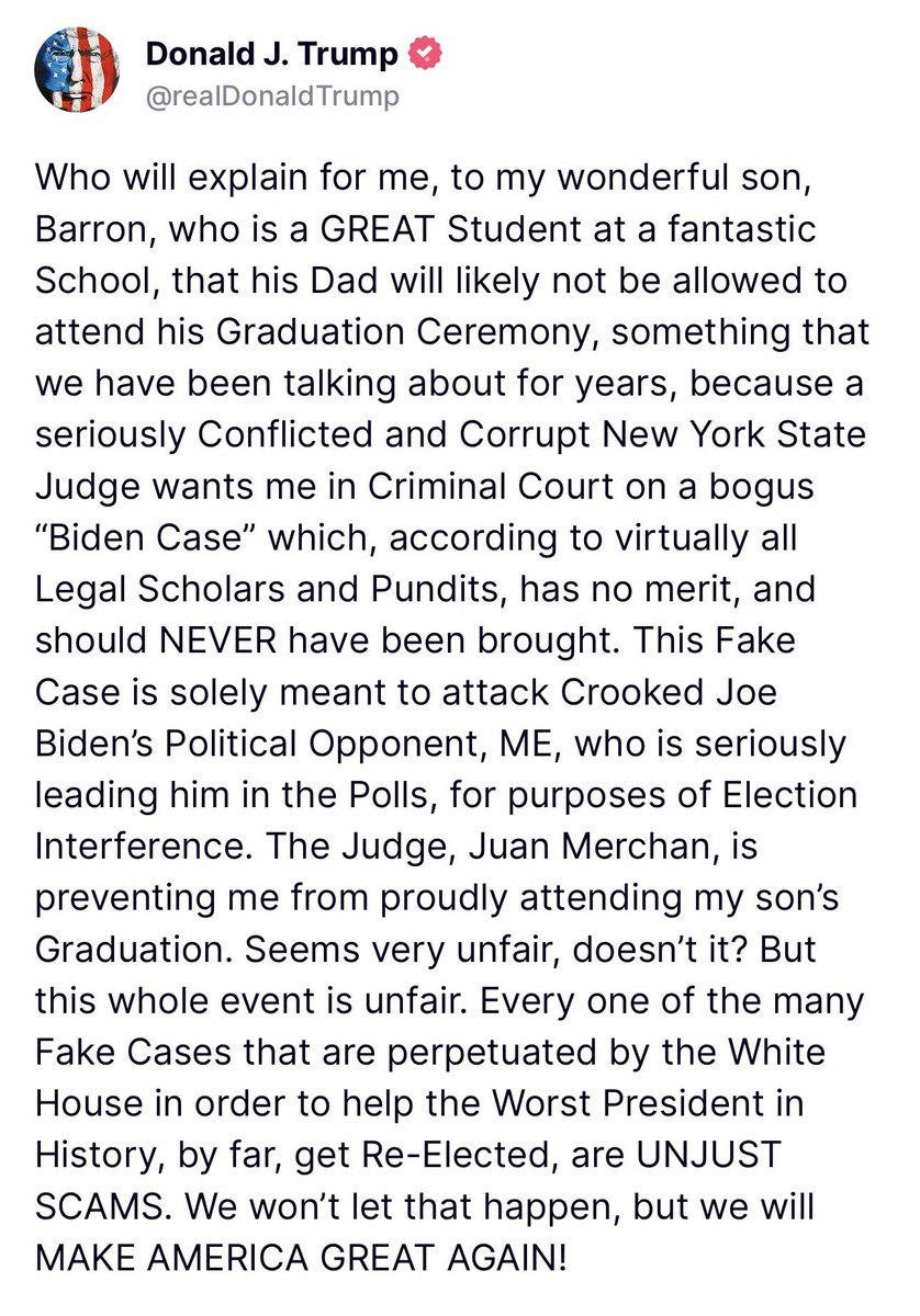 President Trump responds to Biden Donor Judge Merchan threatening to bar him from attending Barron’s graduation: https://t.co/gHEiEHWvzc