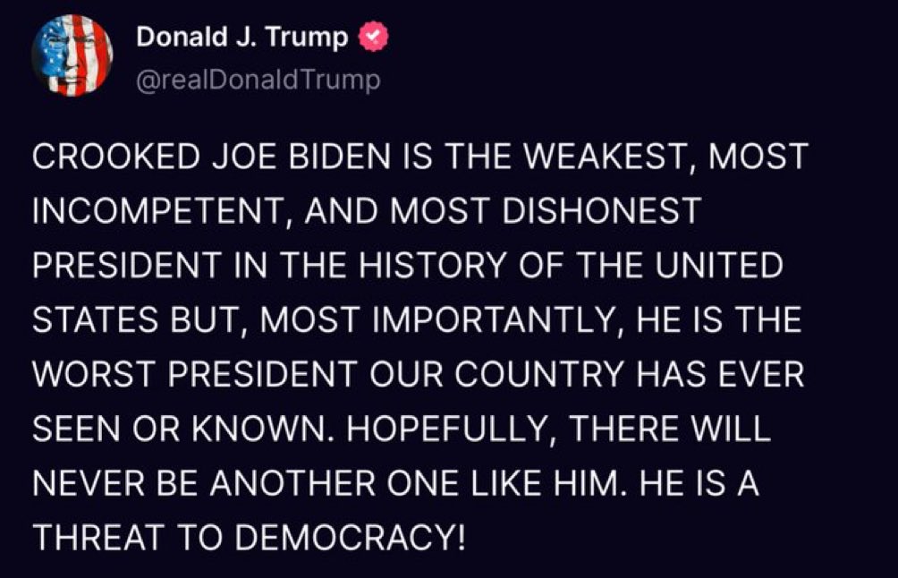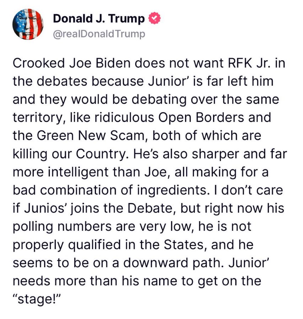 “Crooked Joe Biden does not want RFK Jr in the debates because Junior would be debating over the same territory, like ridiculous open borders and the green new scam, both of which are killing our country.”