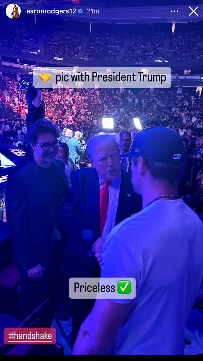 Jets QB @AaronRodgers12 posted a picture of him shaking President @realDonaldTrump’s hand last night at #UFC302 and called the experience “priceless.”