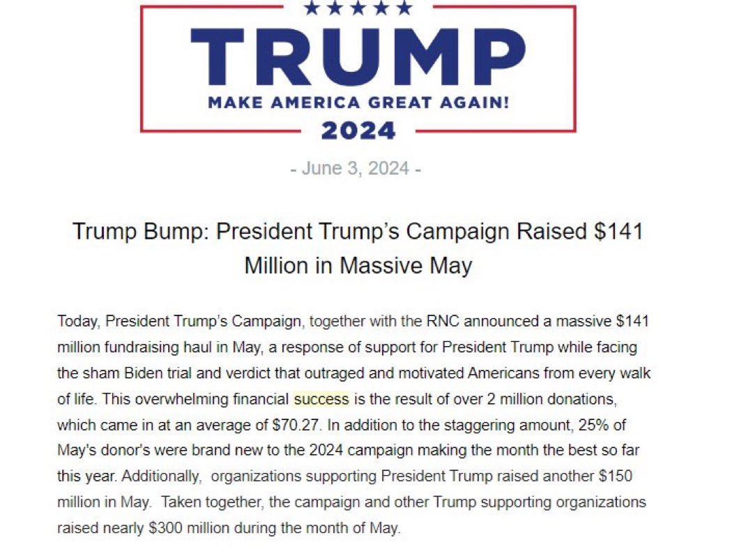 🚨President Trump’s campaign raised $141M in May from over 2 million donors with an average donation of $70.