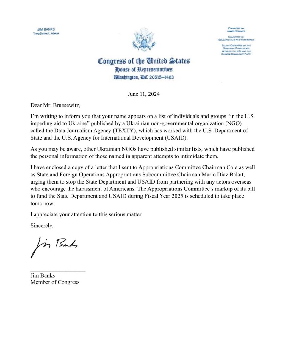 ๐จI just received a letter from Congressman @Jim_Banks notifying me that my name was included on an โenemies of Ukraineโ list that received funding from Bidenโs State Department.