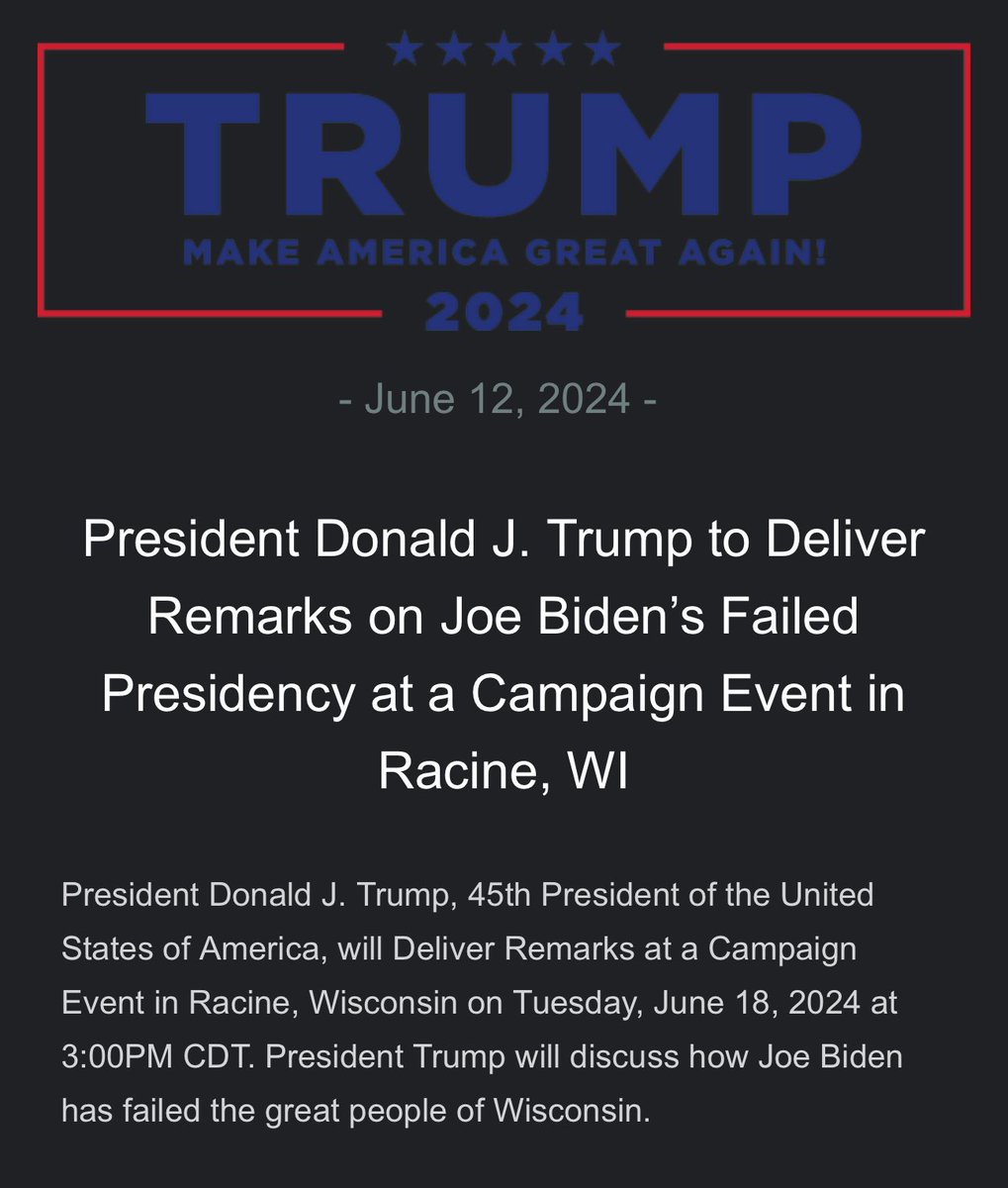 ๐จPRESIDENT TRUMP HEADING TO RACINE, WI NEXT WEEK ๐บ๐ธ https://t.co/YtE6maTzip