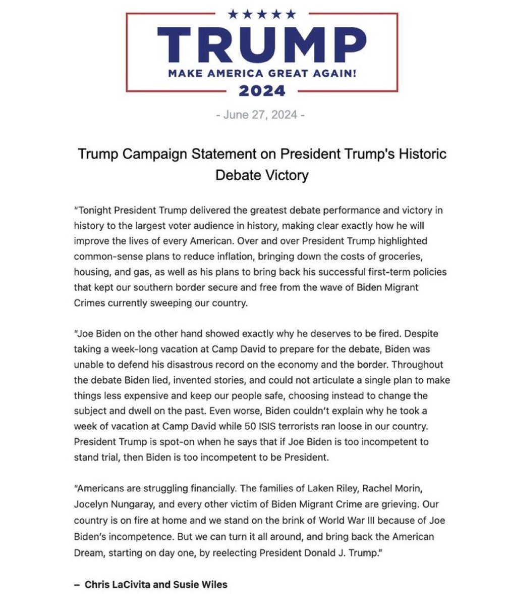 ๐จTRUMP CAMPAIGN STATEMENT ON PRESIDENT TRUMPโS HISTORIC DEBATE VICTORY https://t.co/DNWhWQZqsy
