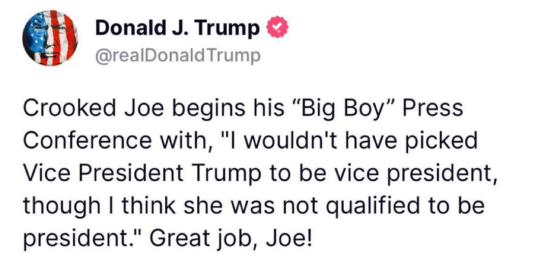 Trump: โyou have to give him credit for one brilliant decision: picking Kamala Harris as his VP was the greatest insurance policy of all time. If Joe had picked someone even halfway competent, they would have bounced him from his office years ago.โ