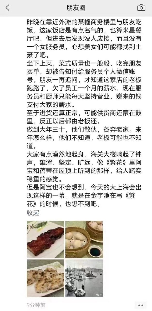 追问才知老板跑路了,欠了员工一个月的薪水,现在服务员和厨师每天坚持营业,赚钱支付大家的薪水。做到大年三十散伙…