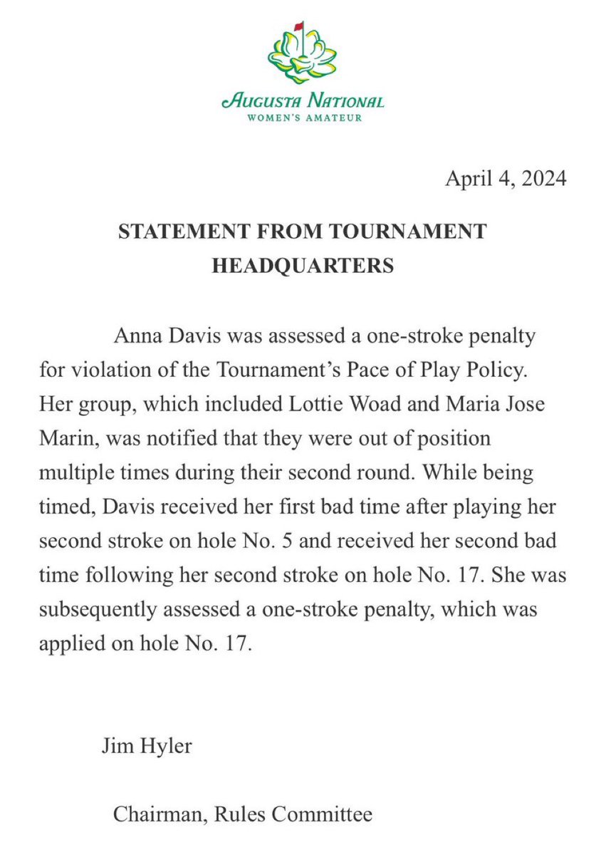 🚨⛳️😔 Anna Davis missed the cut by one at the @anwagolf after she received a one stroke penalty for violating the pace of play policy on #17. This is the second year in a row penalties have plagued Davis at the ANWA. https://t.co/5P6rOupjs4
