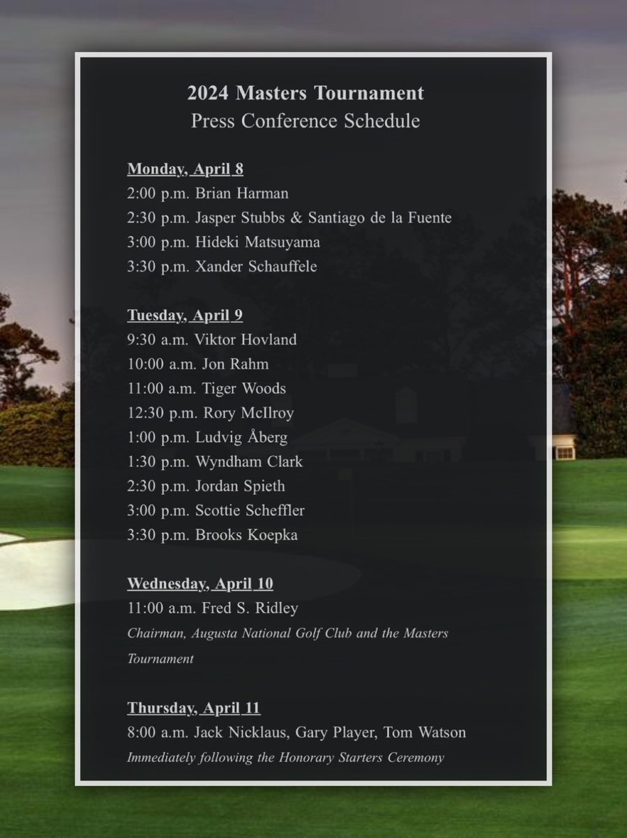 🚨🌺🎙️ Masters interview schedule for next week, per @Daniel_Rapaport https://t.co/Ed8mvS26La