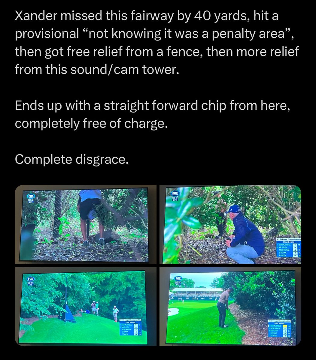 🚨🫳👀 #DropGate — Xander Schauffele talked about the ruling he received during Round 1 of @WellsFargoGolf: “Yeah, I hit it in the trees. My ball was probably like a foot, two feet from the fence. If I -- ball was here, fence was kind of here, hitting back this direction. If I went towards the green, the fence kind of worked this way so I had what I could hit, a 4-iron or something low and just kind of run it through. If it gets stuck, I'll just kind of hit my next one out.