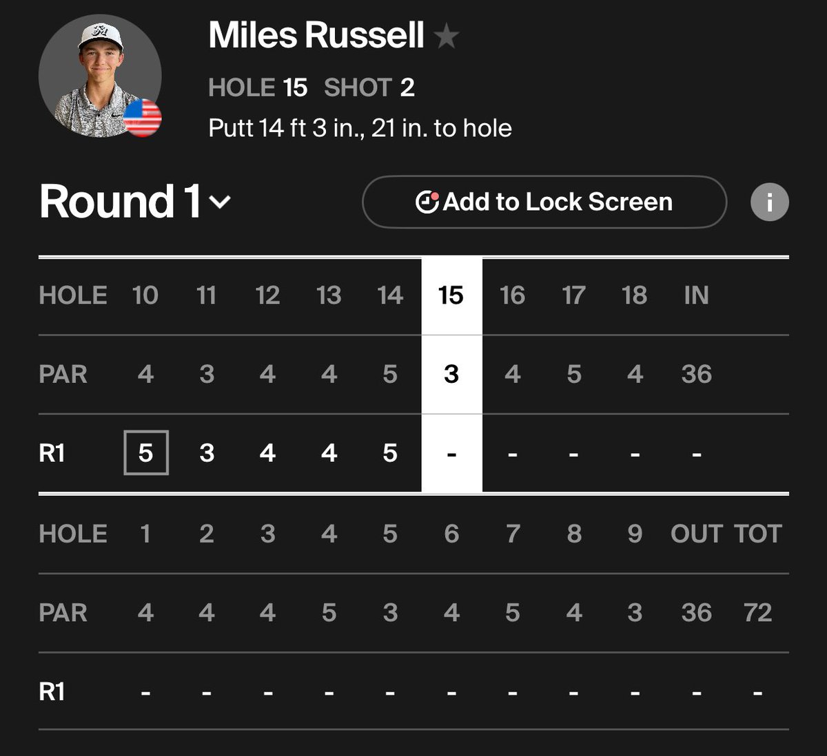 ๐จ15 year old Miles Russell steadies the ship after an opening bogey at the Rocket Mortgage. Heโs +1 through 5 holes. https://t.co/P1gh6w3vA8