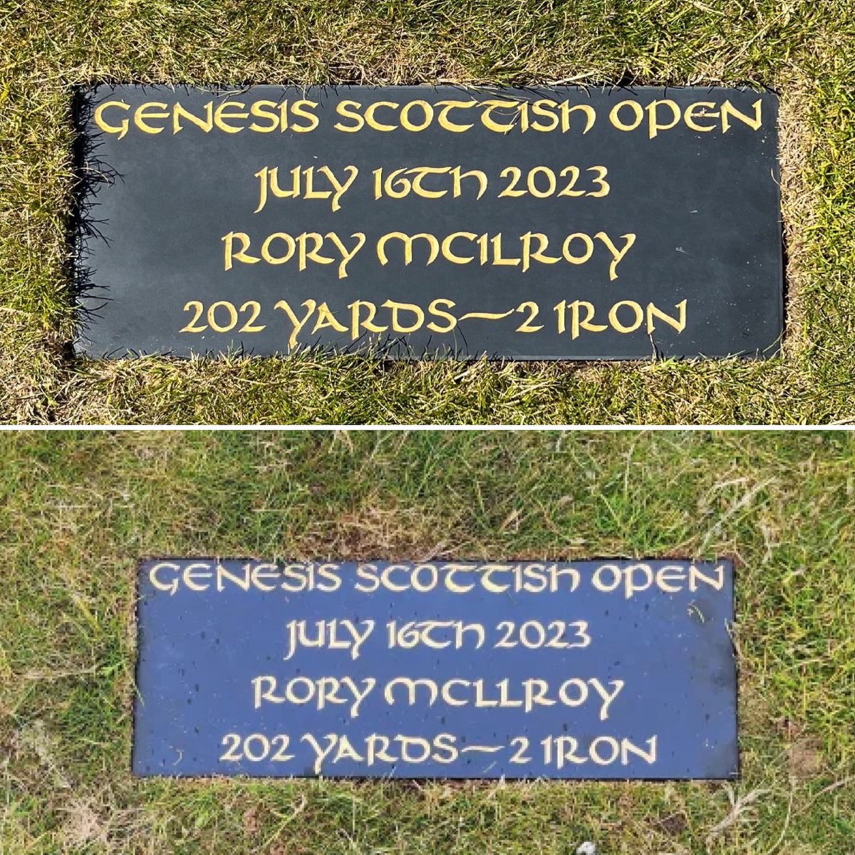 🚨🪧😬 Rory McIlroy on the plaque installed to commemorate his clutch shot on 18 at last years @ScottishOpen: “…I've seen it online, yeah. They spelt my name wrong first time around. It's there now thankfully.” @TrackingRory https://t.co/9IqG9YjldG