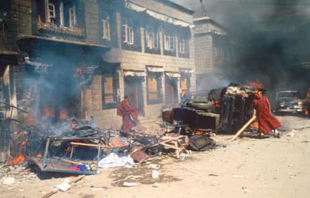 温和派中国人有种认知是「藏人非常和平」,这完全基于汉人的刻板印象。图博发生过三次大规模起义,当然存在很多被中国人认为是暴力的事。例如前两张图是藏人放火烧毁警察局的画面。后者则展现了拉萨人民向军队车辆投掷石块、焚烧汉人店铺的壮举。哪里有压迫,哪里就有反抗,别以为雪山狮子不怒吼。 https://t.co/6A3a81w9El