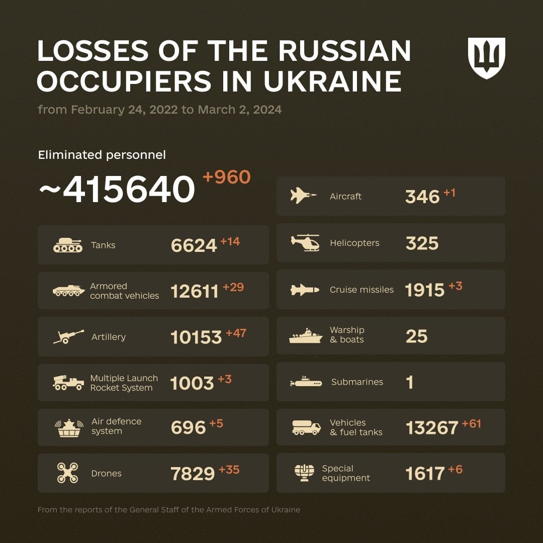 https://www.europesays.com/1083138/ Combat losses of the enemy from February 24, 2022 to March 2, 2024 #RussiaUkraineWar #Ukraine #UkraineWar