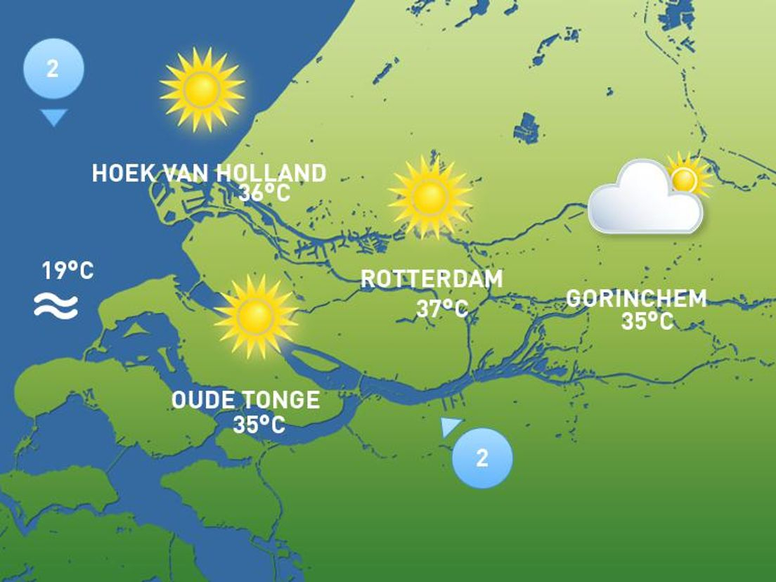 Het wordt vandaag bijzonder warm met aan het einde van de ochtend al tropische temperaturen tot rond de 30 graden. Vanmiddag warmt het in de volle zon verder op naar waarden tussen 34 en lokaal 37 graden. - https://www.rijnmond.nl/nieuws/2034367/het-weer-van-vandaag-extreem-warm-tot-lokaal-37-graden