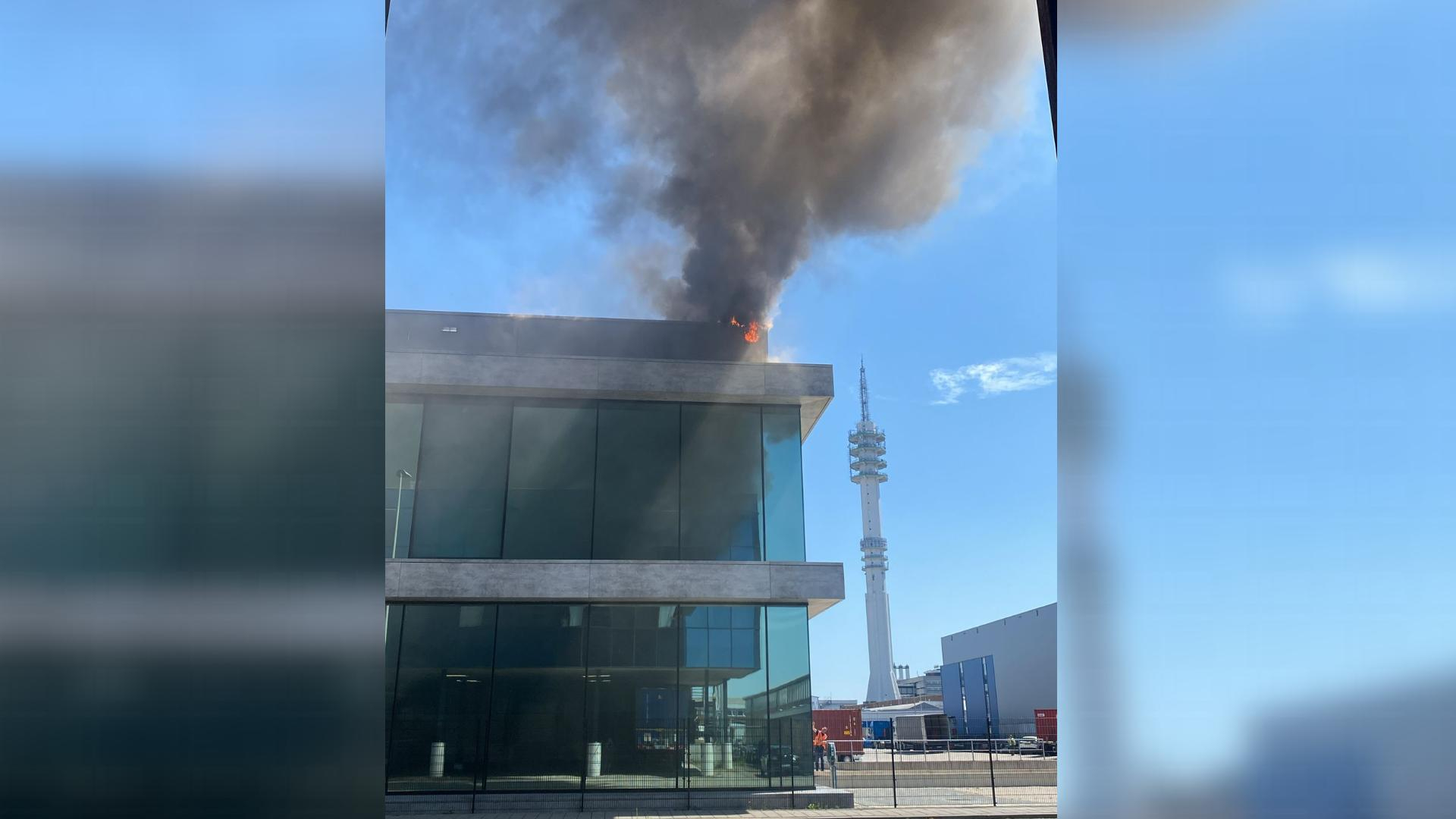 Vlammen en zwarte rook: gevel van kantoor overslagbedrijf in haven in brand