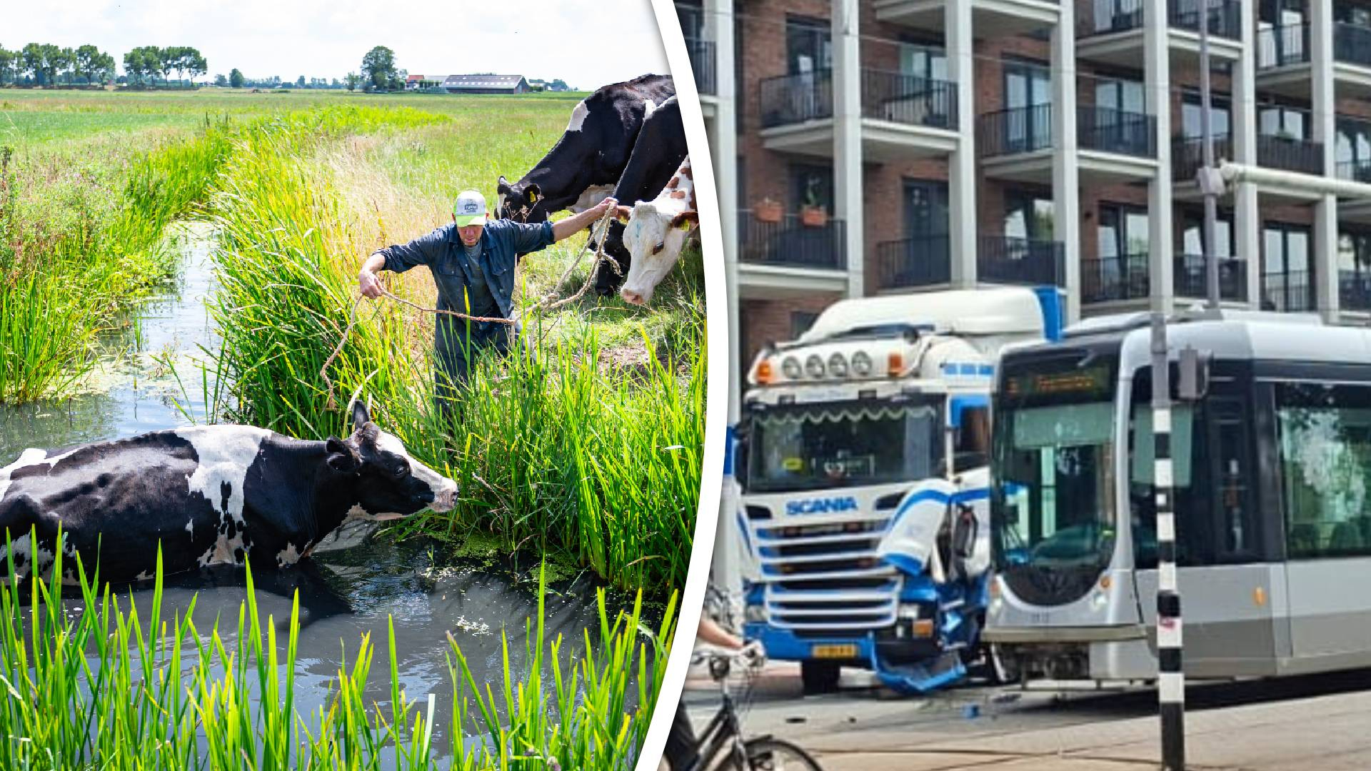 Koe zoekt verkoeling in sloot | Vrachtwagen botst met tram