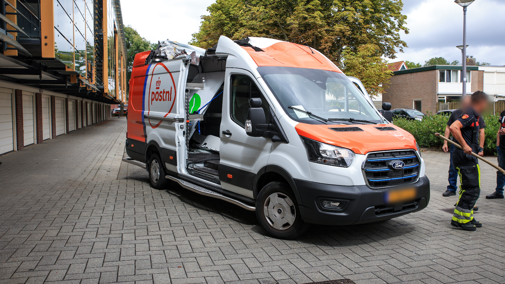 Postbezorger rijdt tegen gevel en verliest dak van gloednieuwe bus