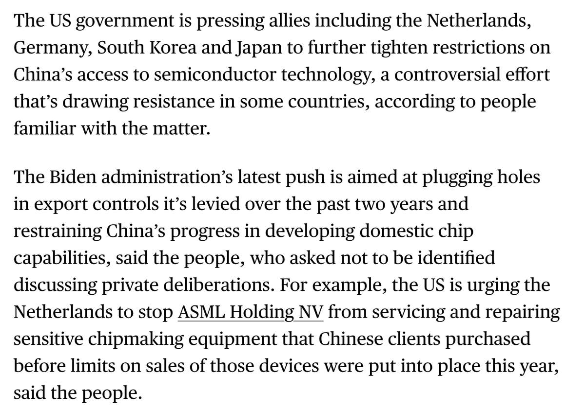 据彭博社消息,美国政府正在向荷兰、德国、韩国和日本等盟国施压,要求进一步收紧对中国获取半导体技术的限制。