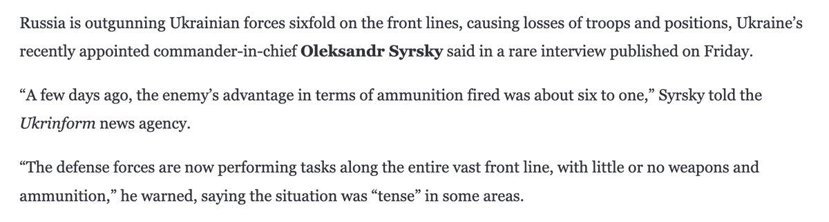 乌克兰武装部队总司令亚历山大·瑟尔斯基周五在接受乌克兰通讯社采访时表示战场形势艰难。战场上俄军在弹药方面与乌军相比较拥有六倍的优势。“就在数天前,敌人在所发射的弹药方面的优势接近6:1。” https://t.co/2lQNXUe2tx