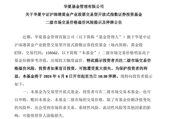 华夏基金:华夏中证护身港黄金产业ETF将在4月8日(周一)开市起至10:30停牌,因二级市场交易价格明显高于基金份额参考净值。 https://t.co/Po1HkBAvK4