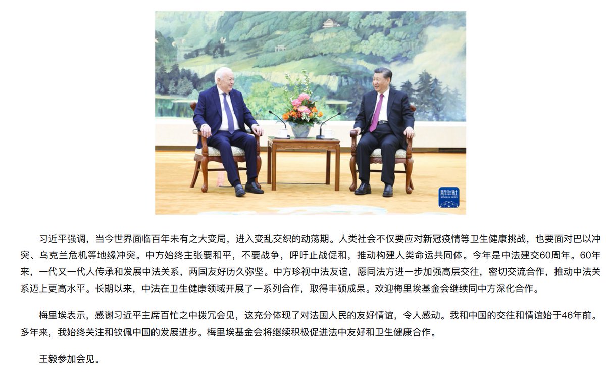 习近平会见法国梅里埃基金会主席梅里埃夫妇,称愿同法方进一步加强高层交往,密切交流合作。 https://t.co/7uaD6xMb3z