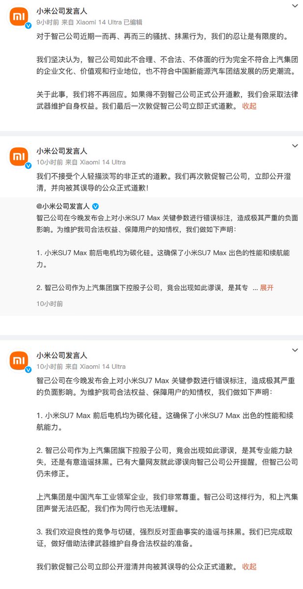 随后小米连发三条警告要求智己正式公开道歉,否则采取法律武器。 https://t.co/1ralXRx7ki
