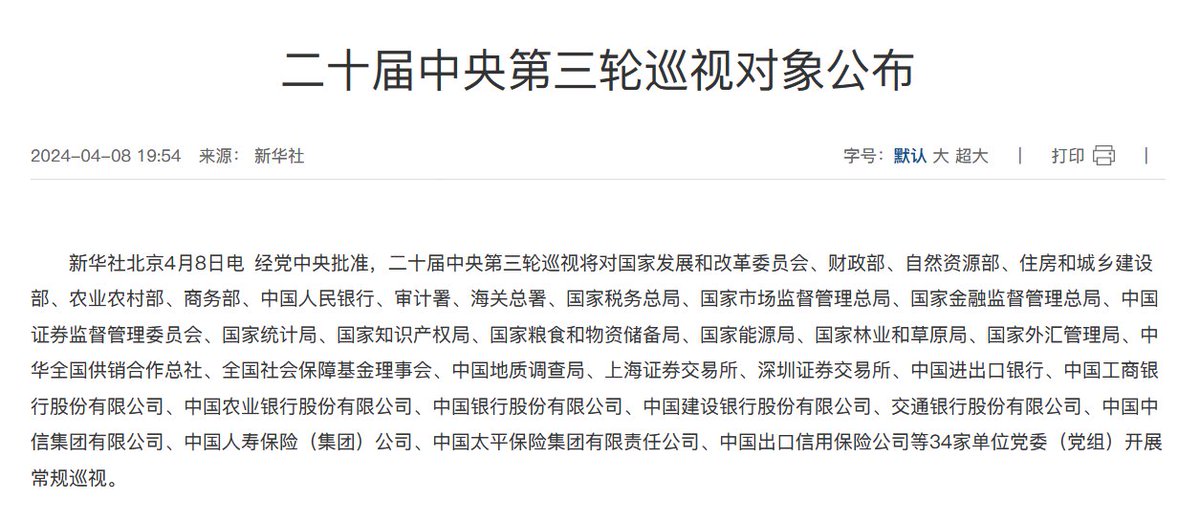 二十届中央第三轮巡视对象公布,此轮巡视将对发改委、金管总局、央行、粮食和物资储备局、全国供销合作总社、粮食和物资储备局、五大国有商业银行等34家单位党委(党组)开展常规巡视。 https://t.co/Btebfgs0OL