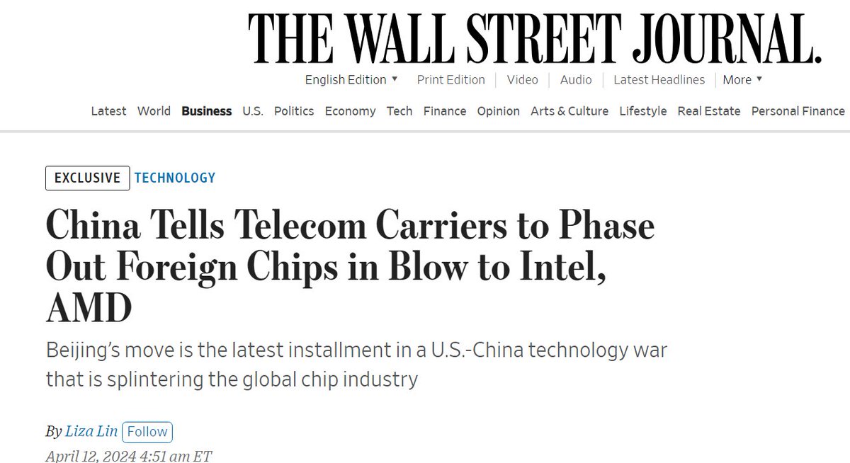 #刚刚 华尔街日报报道称,中国要求电信运营商在2027年前逐步替换外国芯片,此举将打击Intel与AMD。 https://t.co/BkUilQCmr6
