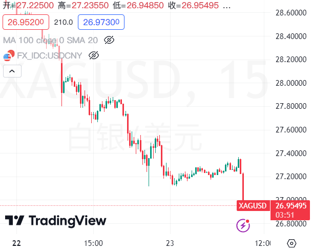 #行情 现货白银持续回调,现跌破27美元。 https://t.co/XQsKK6cCjO