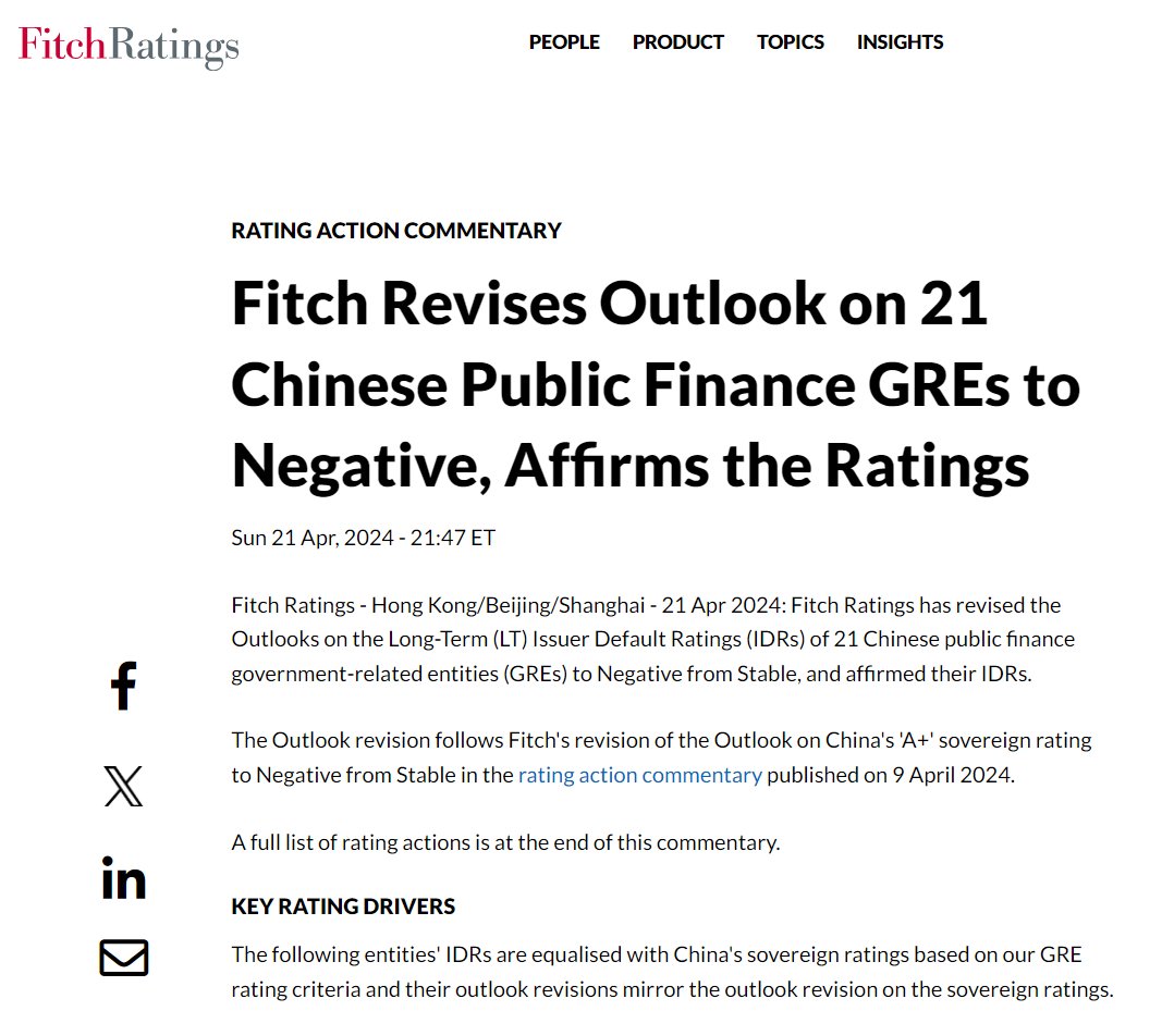 惠誉评级将21家中国公共财政政府相关实体(GRE)前景展望下调至负面。惠誉称,基于自上而下的方法,对政府为GRE提供支持或其他合法资源的能力的信用观点受到主权前景展望下调的影响。 https://t.co/mH9niBQB9V