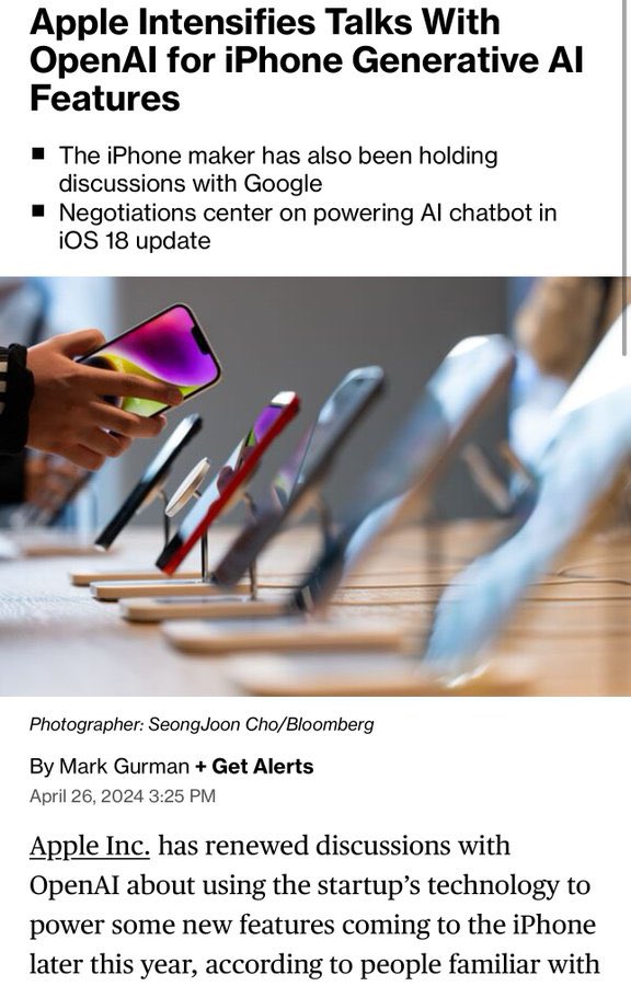 知情人士透露,苹果重新加强与OpenAI磋商,以便在今年发布的新iPhone中增加AI功能。双方已经开始讨论一份潜在合作协议的条款,以及如何将功能整合到iOS18。