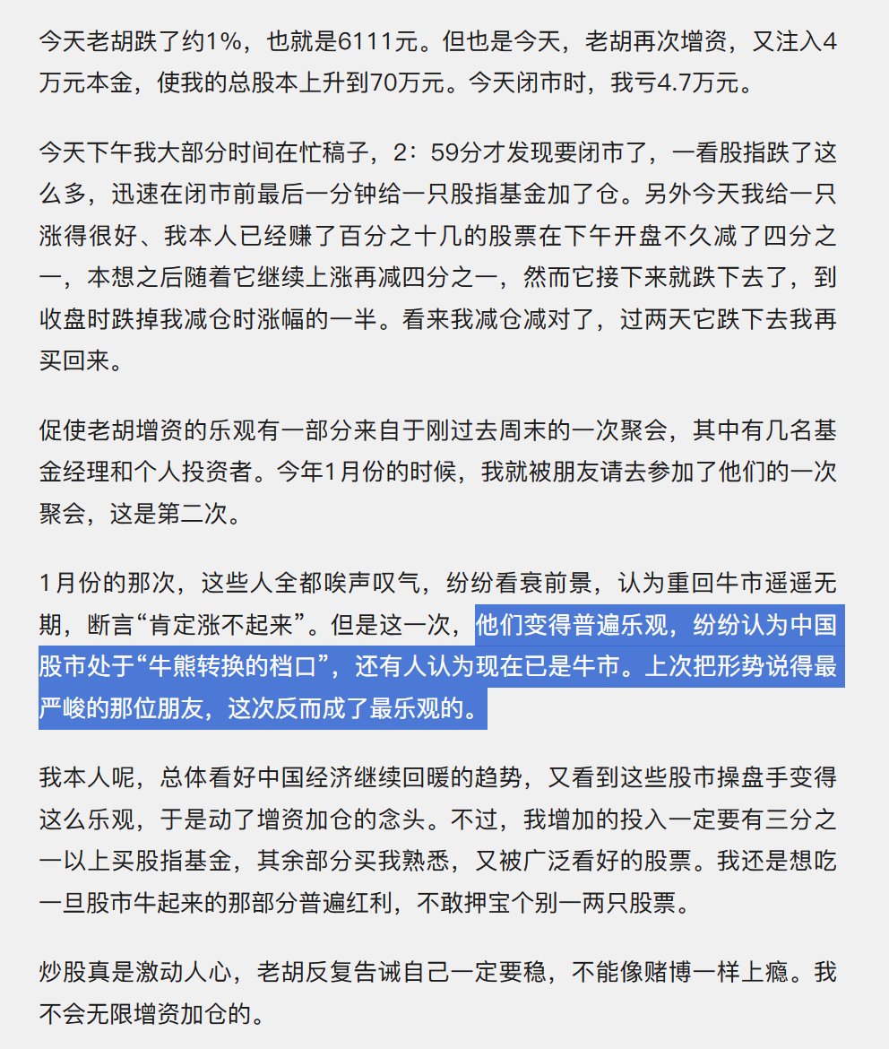胡锡进更新炒股日记:亏4.7万元,今日加仓4万元至70万元,周末聚会发现看衰者变得普遍乐观。 https://t.co/DqMX6DD71Q