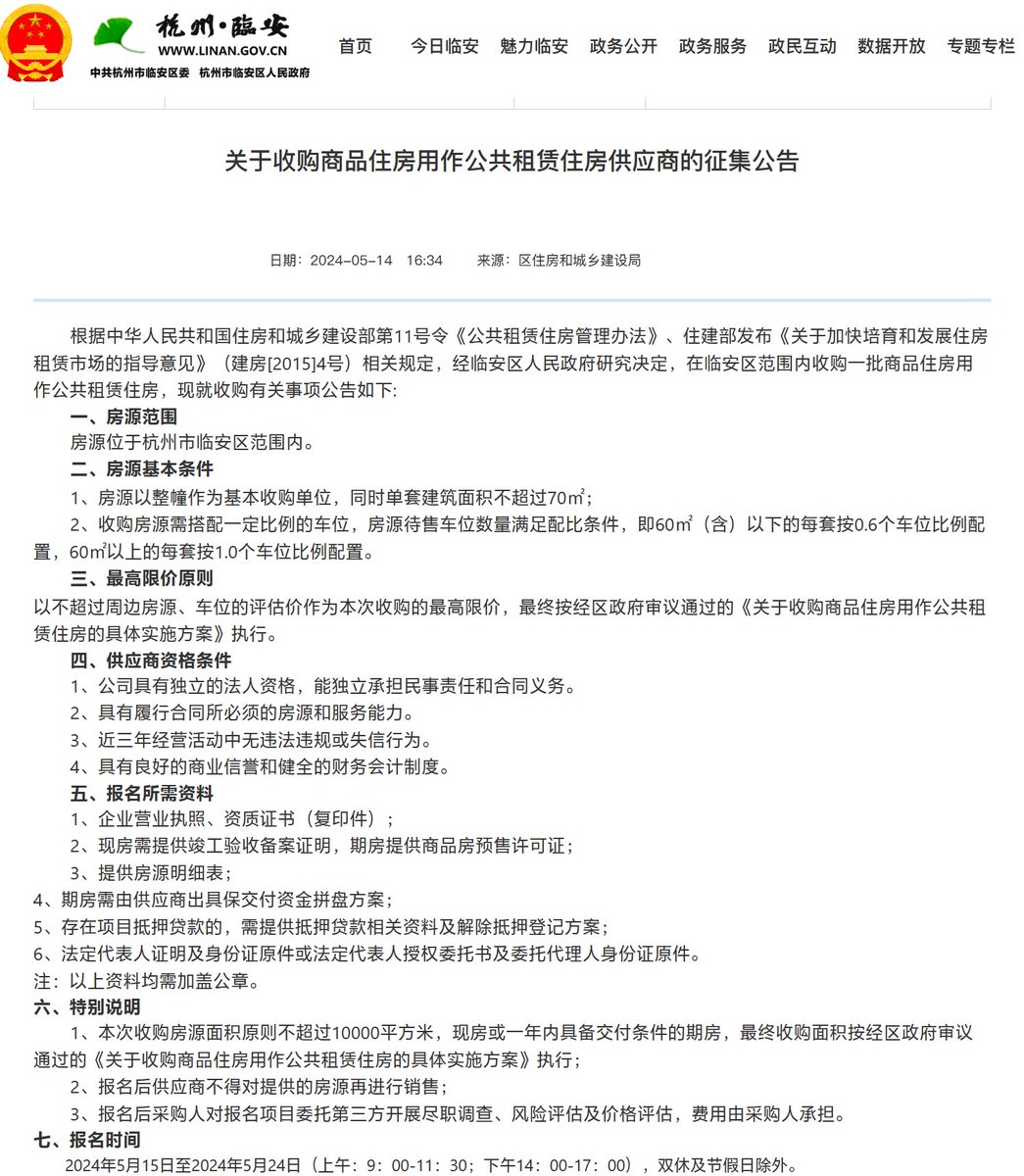 杭州市临安区:在临安区范围内收购一批商品住房用作公共租赁住房。房源要求位于杭州市临安区范围内。要求房源单套建筑面积不超过70平方米,本次收购面积不超过10000平方米。 https://t.co/laJp3x36wk