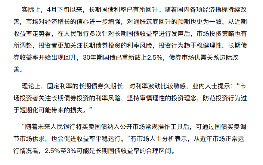 部分机构为增厚收益,集中购买长久期资产,长期限债券需求显著上升,而短期供给偏少。 市场人士表示,“随着未来人民银行将买卖国债纳入公开市场常规操作工具后,可通过国债买卖调节市场供求,也会促进收益率平稳运行。”2.5%至3%可能是长期国债收益率的合理区间。