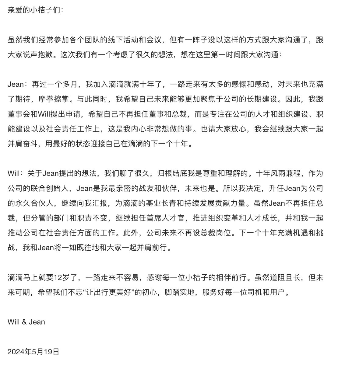 滴滴发内部全员信,程维决定升任柳青(Jean Liu)为公司永久合伙人,柳青不再任公司董事和总裁,公司未来不再设总裁岗位。